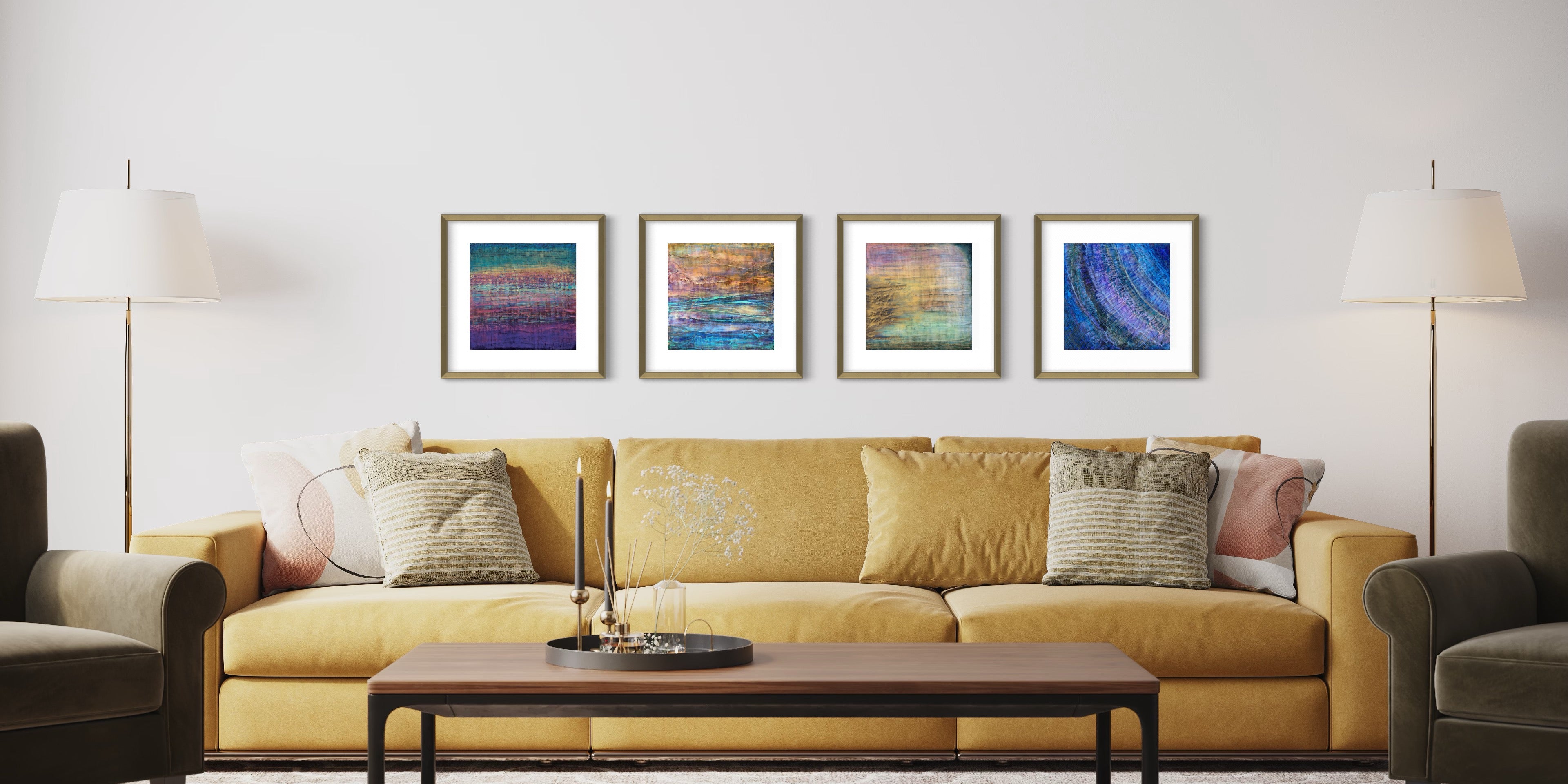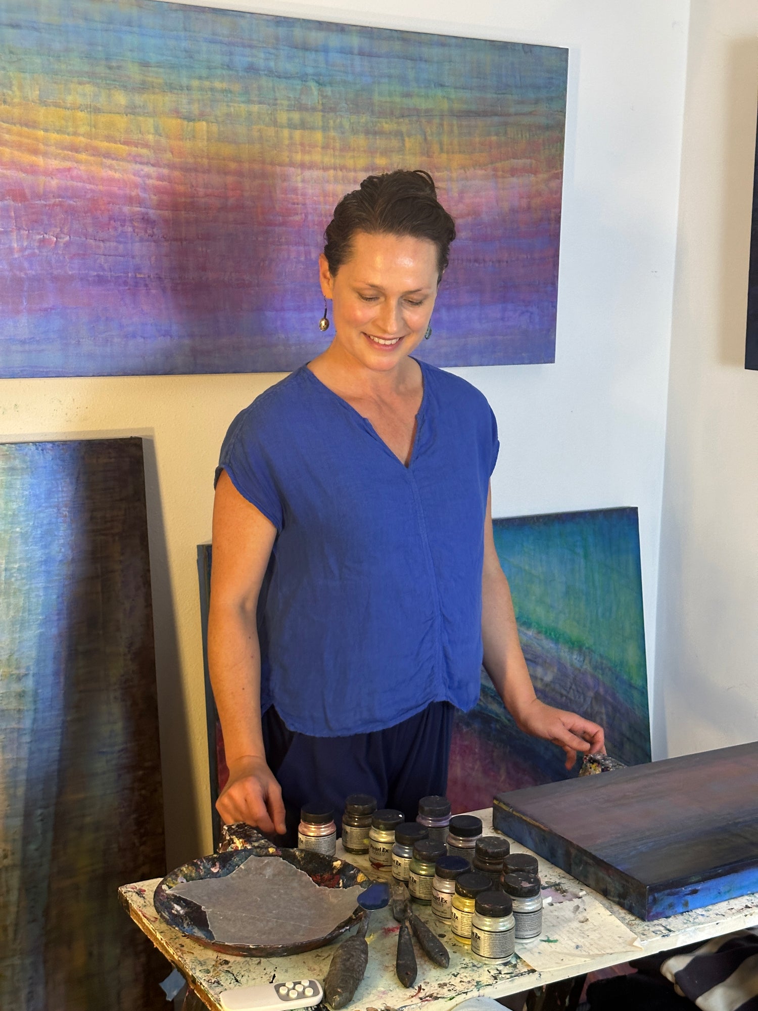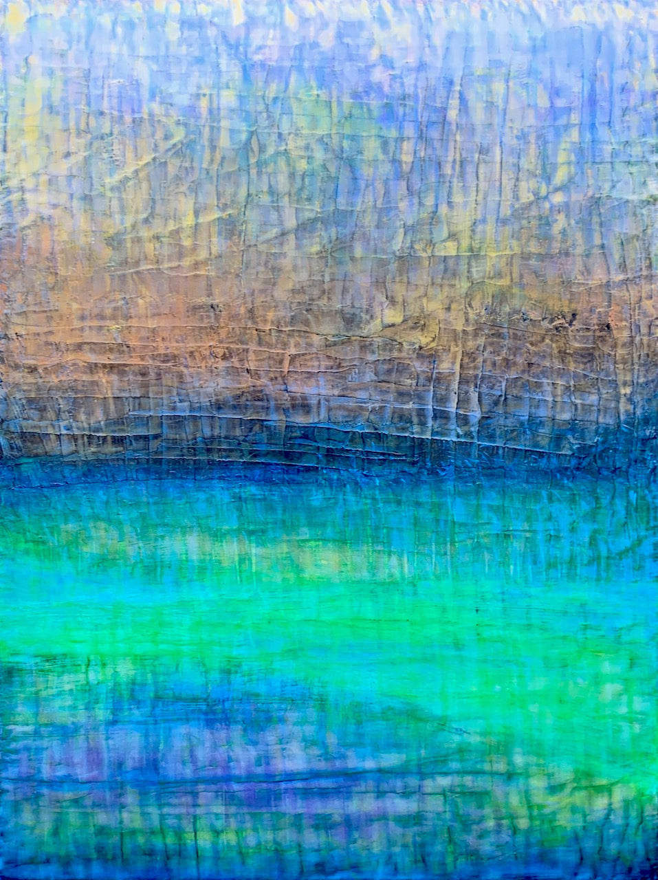 I explore the intersection of these two forces-water and shell-through abstract seascapes that evoke depth, shimmer, and emotion. I paint intuitively using cold wax medium, oil paint, and pearlescent pigments. My process is both additive and subtractive. Using palette knives, layers are built and carved away, creating a rich tactile surface that shifts depending on the viewer's perspective and lighting.Buffing the surface is integral, imparting a luminous quality echoing an abalone shell.
