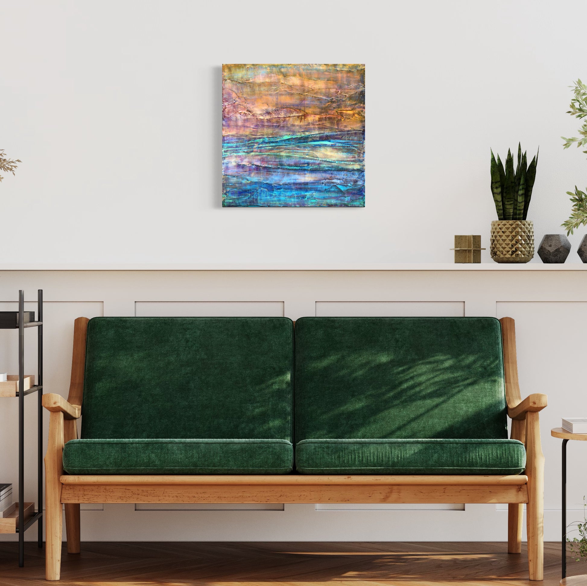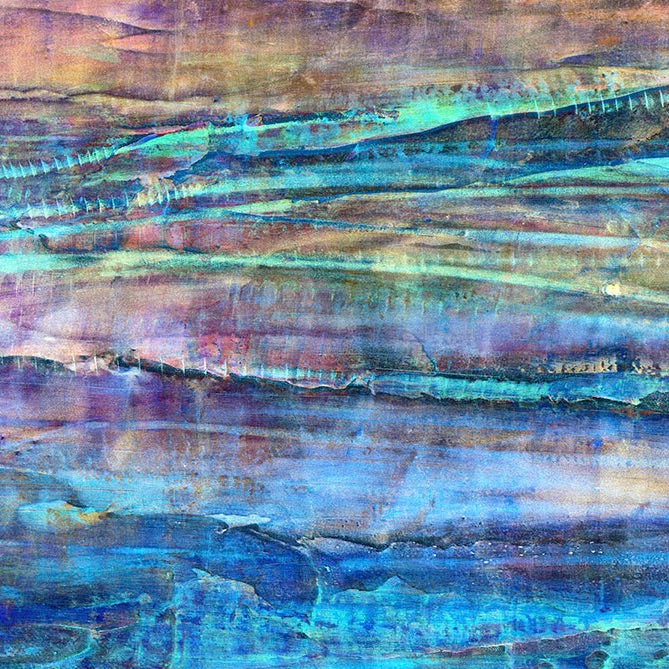 18 x 18 cold wax painting on cradled wood panel. Oil paint, wax medium, powdered pearlescent pigments. International buyers contact me directly for shipping costs, duties and import taxes for your country.