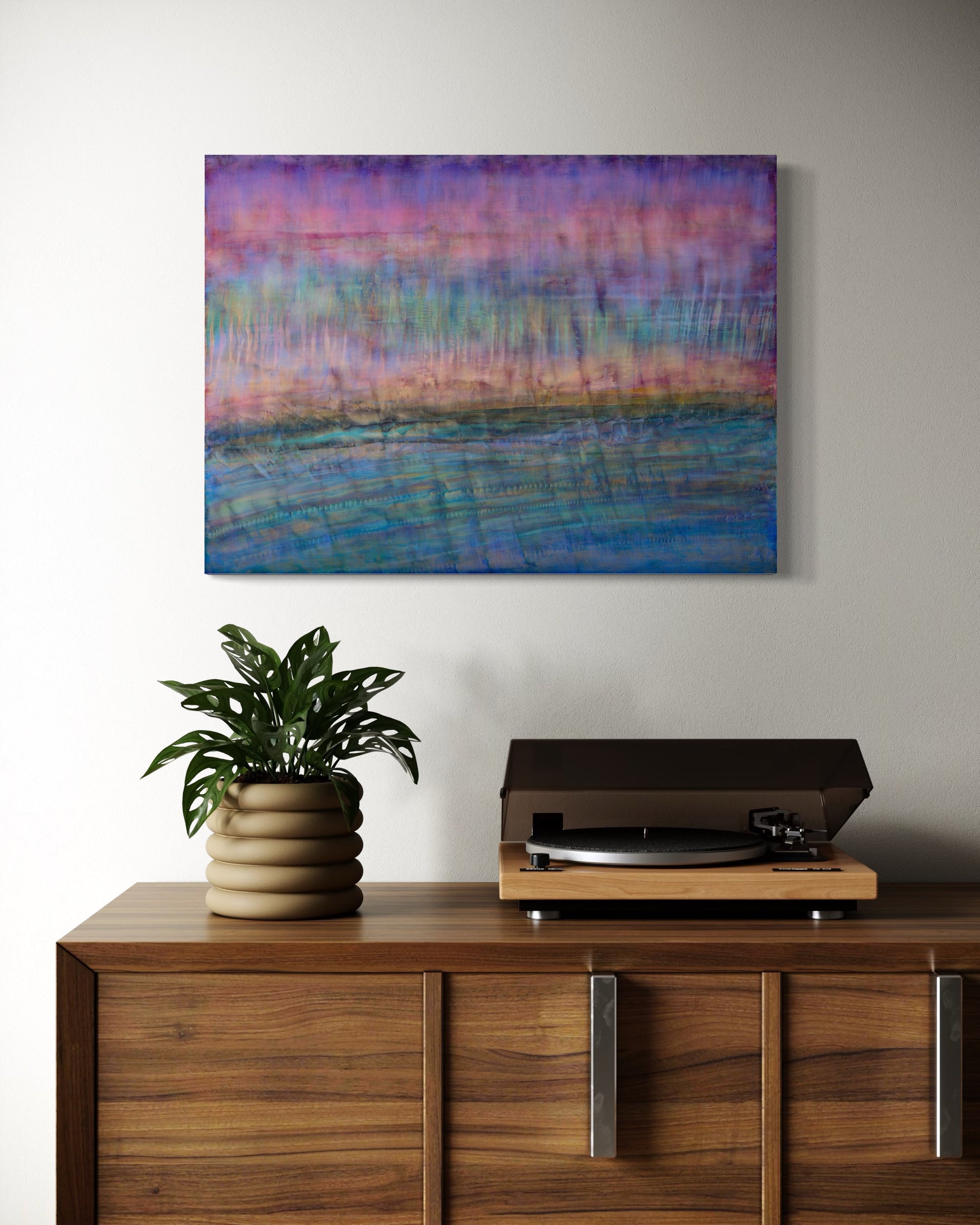22 x 30 cold wax painting on cradled wood panel. Oil, wax medium, powdered pearlescent pigments. International buyers contact me directly for shipping costs, duties and import taxes for your country.