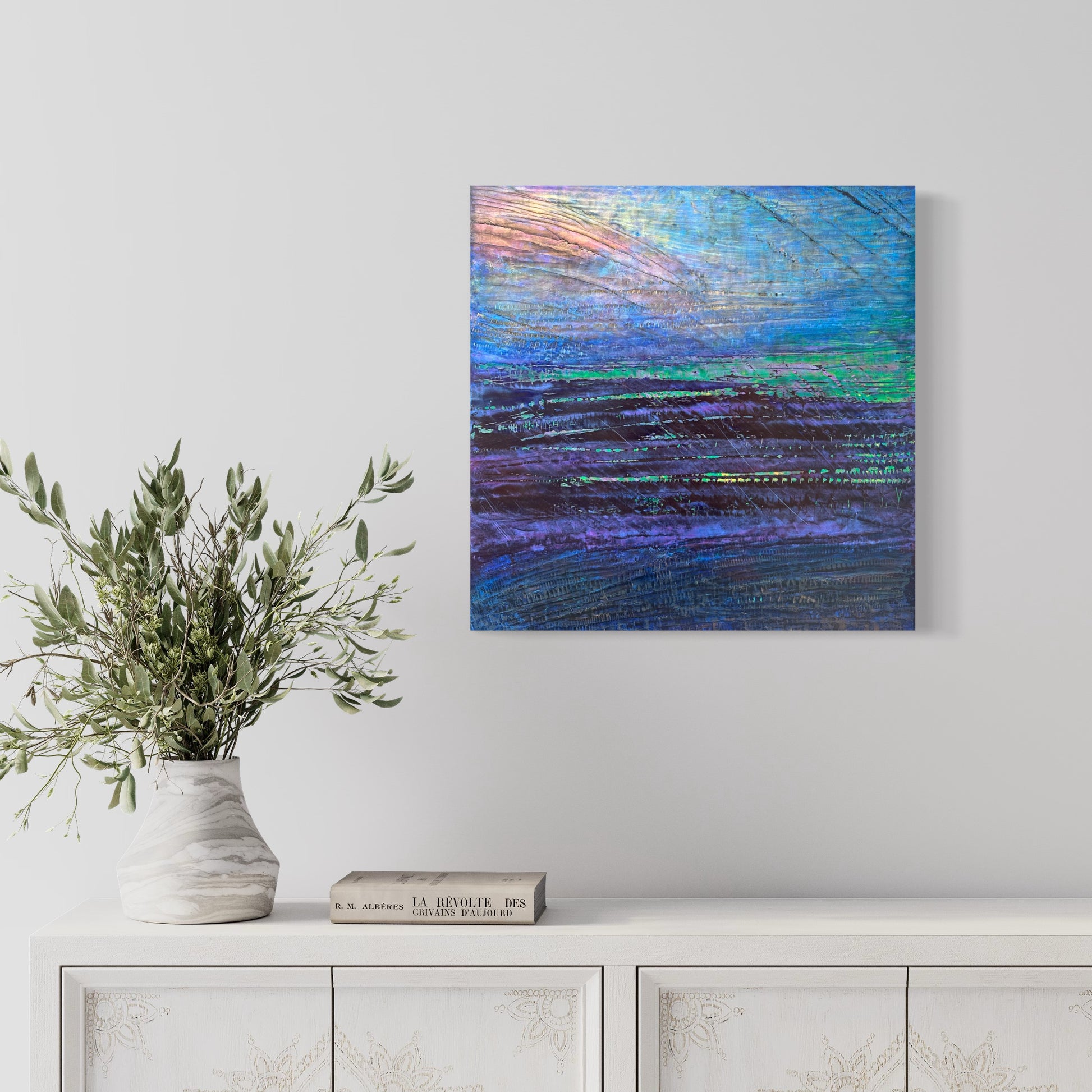 24 x 24 cold wax painting on cradled wood panel. Oil paint, wax medium, powdered pearlescent pigments. International buyers contact me directly for shipping costs, duties and import taxes for your country.
